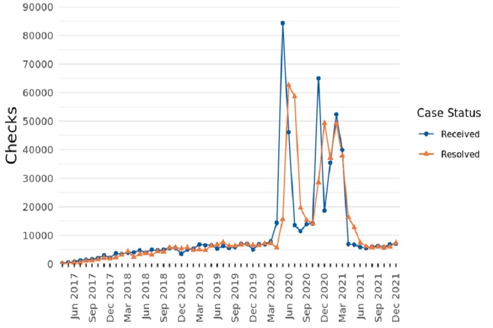 Figure 3 shows the number of Checks received by month and case status. The 19,550 Checks received in the quarter to 31 December 2021 is 3% of the total received since the start of the list in April 2017. The three spikes are attributable to the COVID-19 pandemic and were coincident with government-imposed restrictions on business.