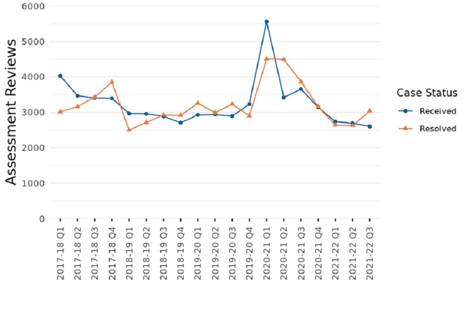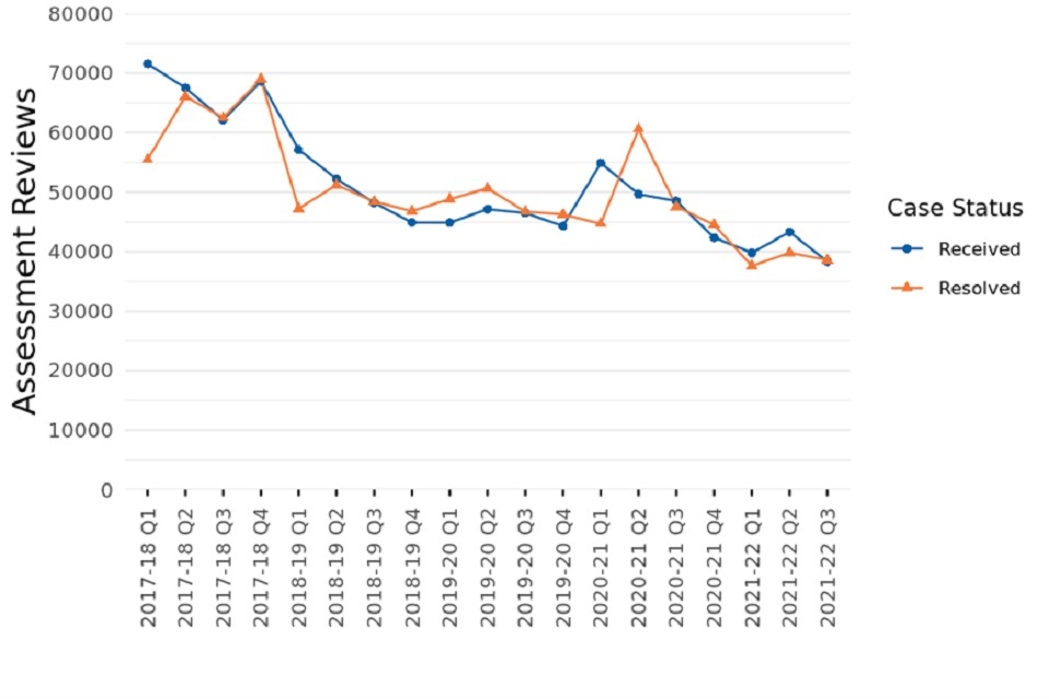 Figure 9: Assessment Reviews against the England 2017 List by case status and quarter, 17-18 Q1 to 21-22 Q3