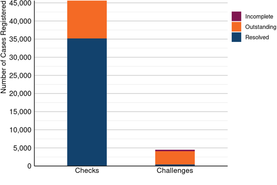 Figure 1 shows that 45,610 Checks have been registered since the start of the 2023 rating list (1 April 2023 to 31 December 2023). Of these, 35,180 have been resolved, and 10,440 remain outstanding.