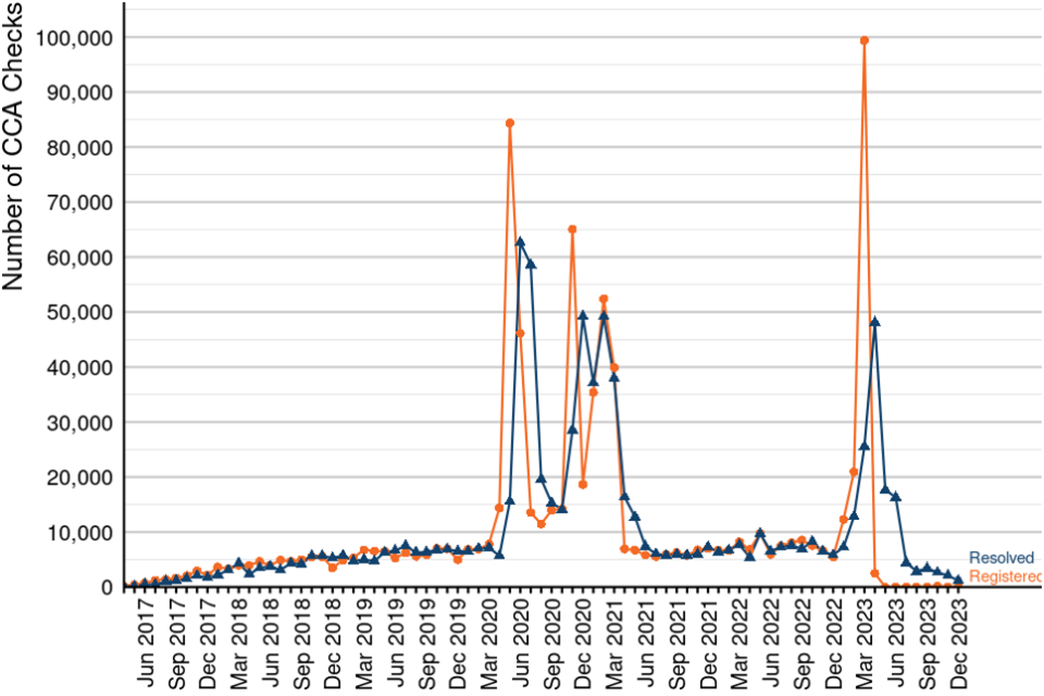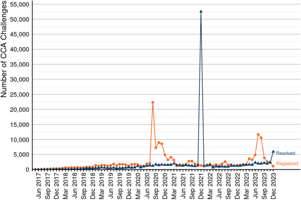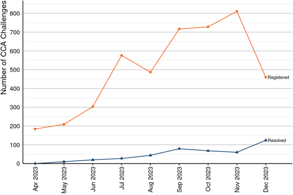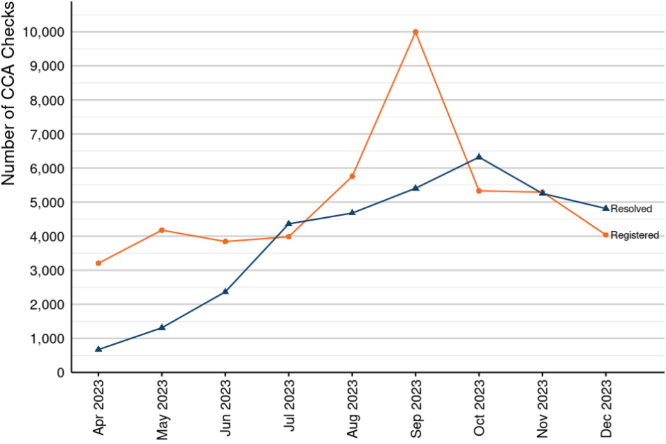 In the latest quarter (October to December 2023), 14,660 Checks were registered, down from 19,730 the quarter before and 16,380 Checks were resolved, up from 14,450 the quarter before. The number of Checks received against the 2023 list is considerably higher than those received in the first six months of the 2017 list. This is because CCA was introduced as a new system in 2017 and it took ratepayers time to become familiar with the process. Although the number of Checks received at the start of the 2017 list were low, they did increase over time.