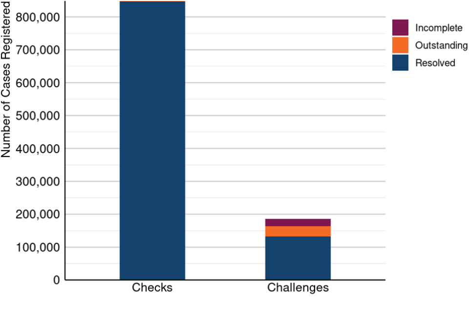 Some of the resolved Checks will progress to Challenge and as such 185,160 Challenges have been registered since the start of the 2017 rating list (1 April 2017 to 31 December 2023). Of these, 132,460 have been resolved, 21,580 have been marked incomplete and 31,120 remain outstanding.