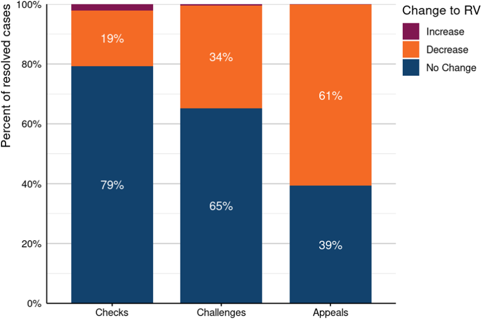 For Appeals, 39% result in no change to RV, 61% result in a decrease and 0.1% result in an increase to RV.