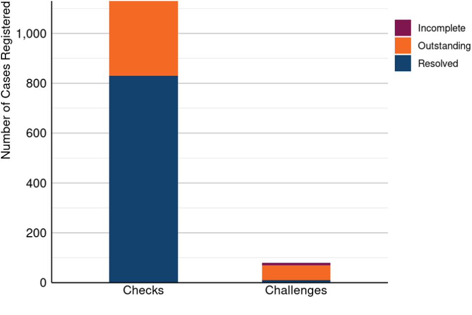 Some of the resolved Checks will progress to Challenge and as such 80 Challenges have been registered since the start of the 2023 rating list (1 April 2023 to 31 December 2023). Of these, 10 have been resolved, 10 have been marked incomplete, and 60 remain outstanding.
