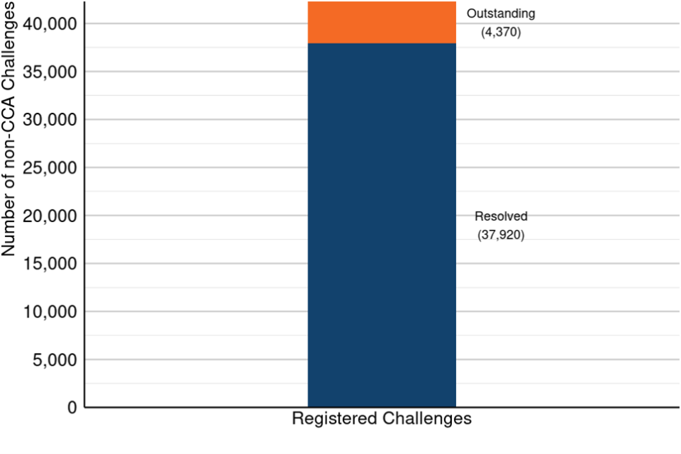 In the latest quarter (October to December 2023), 2,000 Challenges were registered, up from 1,780 the quarter before and 250 Challenges were resolved, up from 150 the quarter before. Challenges take longer to clear as it is necessary to exchange and discuss evidence with ratepayers. There is a statutory deadline of 18 months to clear Challenge cases.