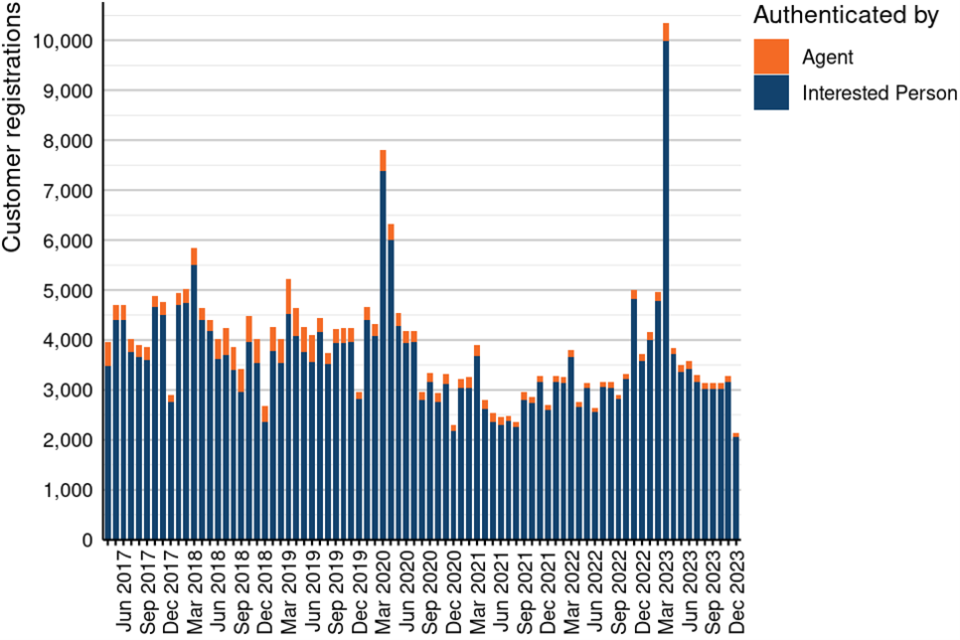 Figure 11: Customer registrations by customer type and month, 1 April 2017 to 31 December 2023