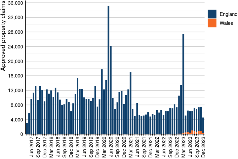 Figure 12: Approved property claims by month and country, 1 April 2017 to 31 December 2023