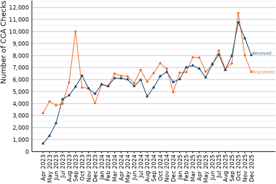 In the latest quarter (October to December 2025), 26,180 Checks were registered, up from 22,610 the quarter before and 28,230 Checks were resolved, up from 22,840 the quarter before. There was a spike in Checks registered in September 2023 relating to properties within the office sector. There is another spike in Checks registered and resolved in October 2025 relating to properties within the retail sector.