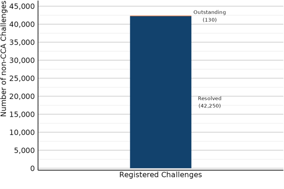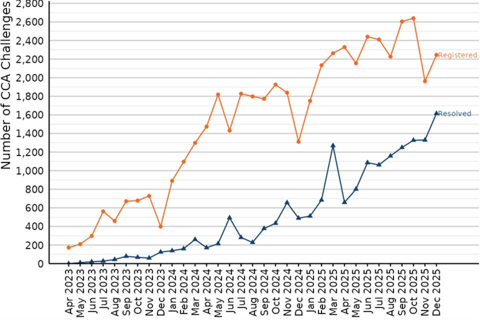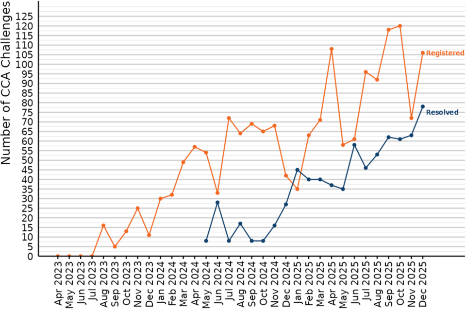 In the latest quarter (October to December 2025), 30 Challenges were registered, down from 60 the quarter before and 1,430 Challenges were resolved, down from 2,270 the quarter before.