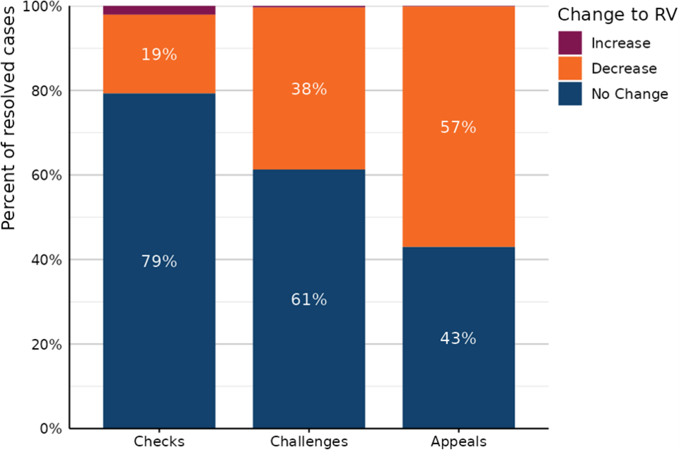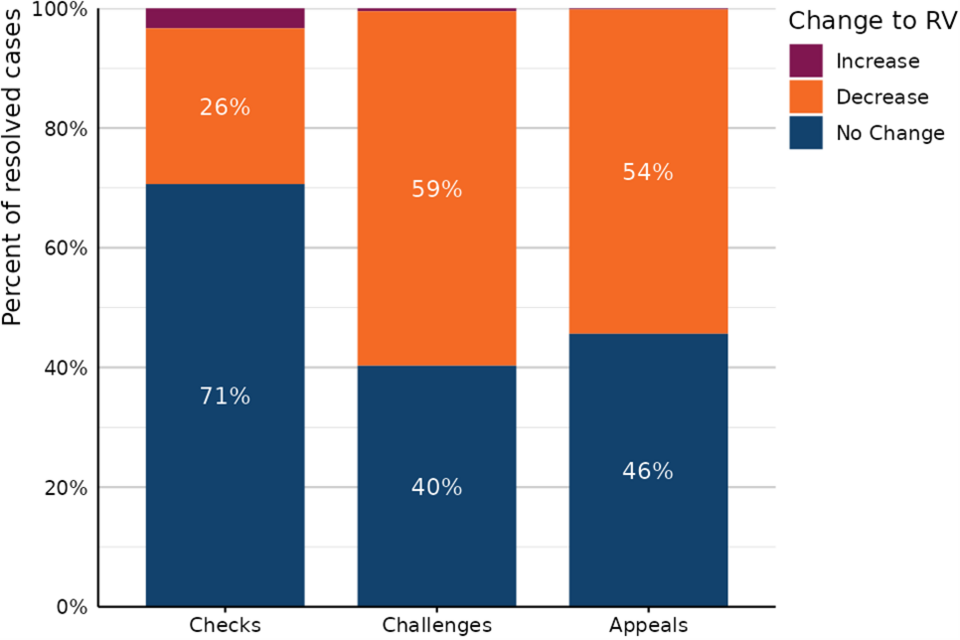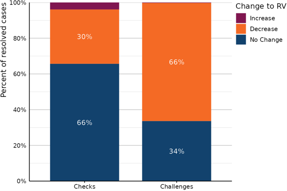Figure 4 compares the proportion of resolved Check and Challenge cases which resulted in a rateable value (RV) increase, decrease, or no change.