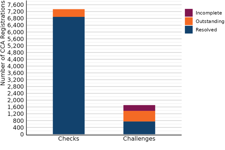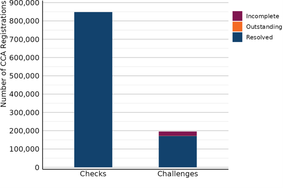 Some of the resolved Checks will progress to Challenges and as such, 49,830 Challenges were registered since the start of the 2023 rating list (1 April 2023 to 31 December 2025). Of these, 17,080 were resolved, 9,130 were marked incomplete (does not contain all the detail required in legislation) and 23,620 remained outstanding.