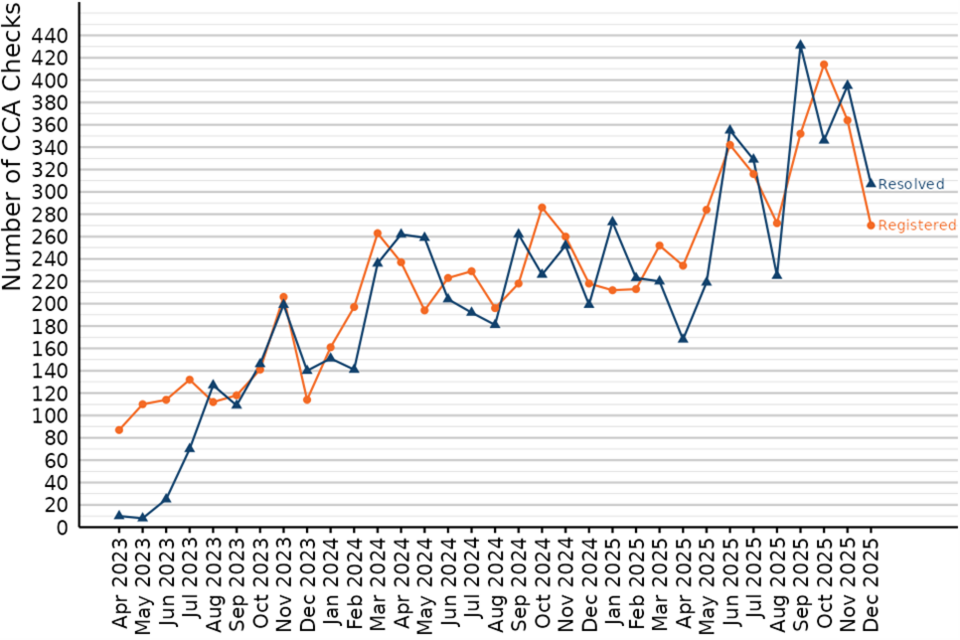 In the latest quarter (October to December 2025), 1,050 Checks were registered, up from 940 the quarter before and 1,050 checks were resolved, up from 990 the quarter before.