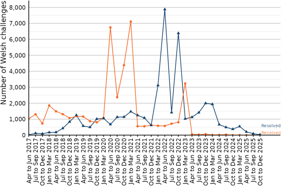 Figure 13 shows the number of challenges received against the Wales 2017 list by quarter. There were 0 challenges registered in the latest quarter (October to December 2025), equal to 0 last quarter, and 30 challenges resolved in the latest quarter, down from 90 last quarter.