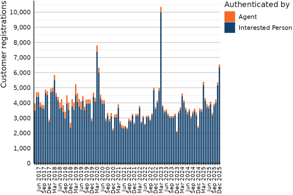 Figure 14: Customer registrations by customer type and month, 1 April 2017 to 31 December 2025