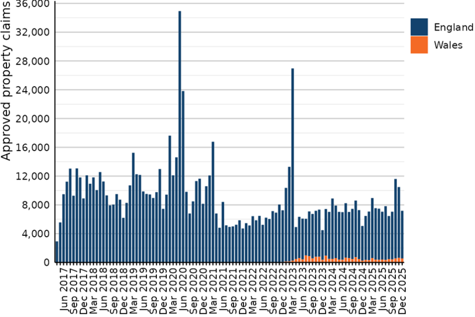 Figure 15: Approved property claims by month and country, 1 April 2017 to 31 December 2025