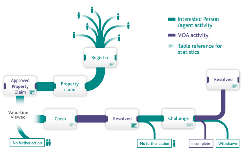 Property claim – before anyone can access more detailed valuation data about a property, they must prove that they have a legal interest in the property under the non-domestic rating legislation, for example as an owner or occupier or both. To do this, they are required to ‘claim their property’ through the VOA’s online service and provide proof of their relationship to the property, such as a copy of a business rates or utility bill. Once the VOA confirm the interested person’s relationship to the property, the claim is approved, and the IP can view or request the detailed valuation for that property. Note that the figures of approved property claims may be adjusted in future publications to reflect where claims have been updated.