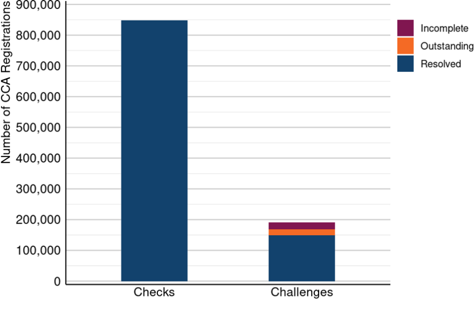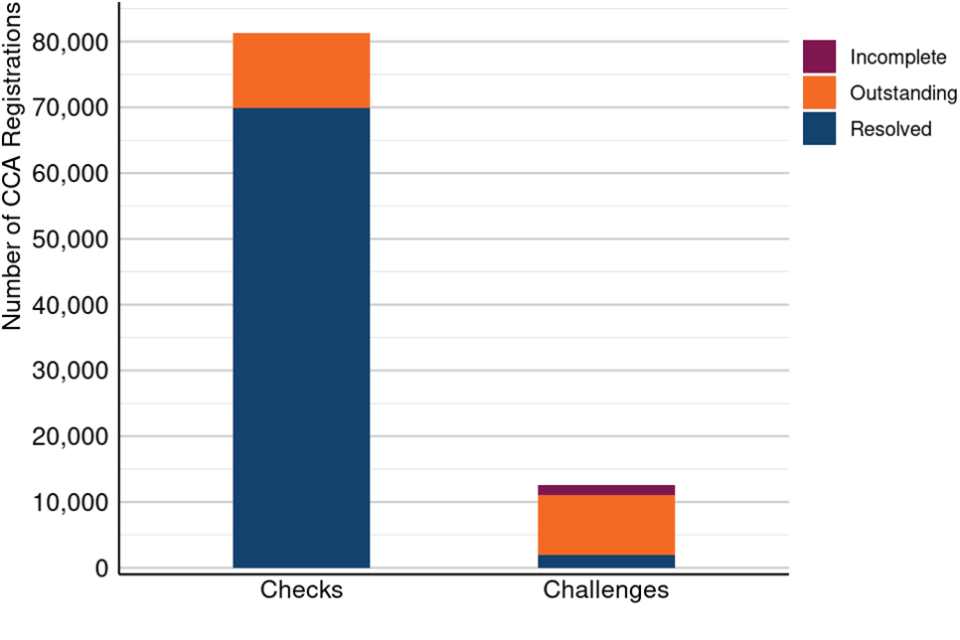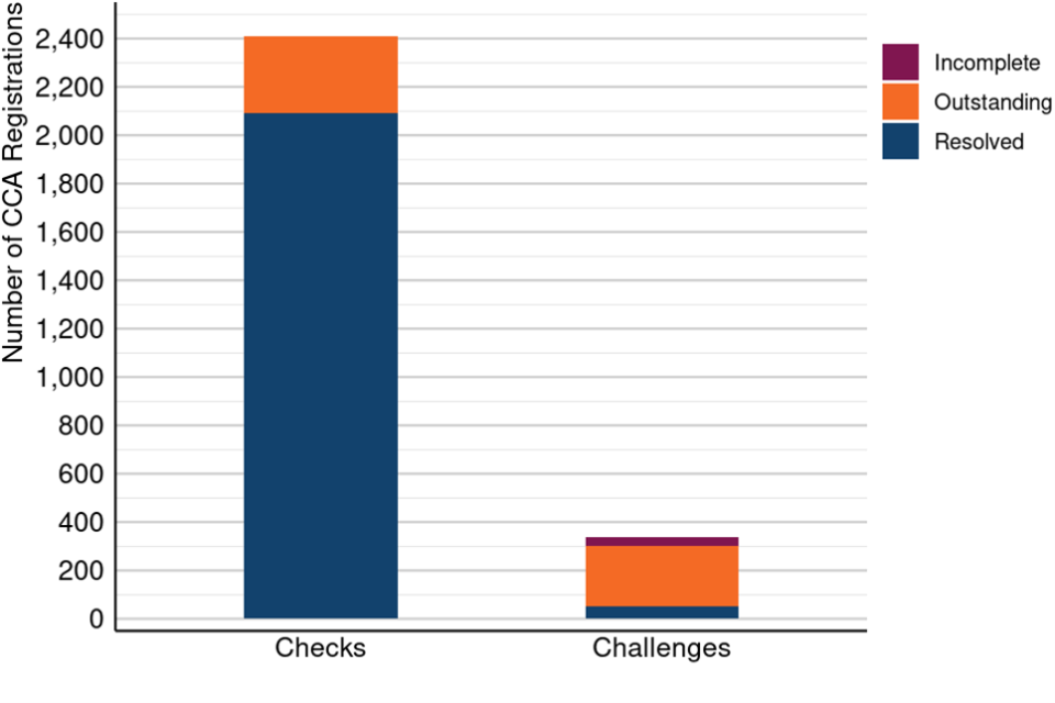 Some of the resolved Checks will progress to Challenge and as such, 340 Challenges had been registered since the start of the 2023 rating list (1 April 2023 to 30 June 2024). Of these, 50 had been resolved, 40 had been marked incomplete, and 250 remained outstanding.