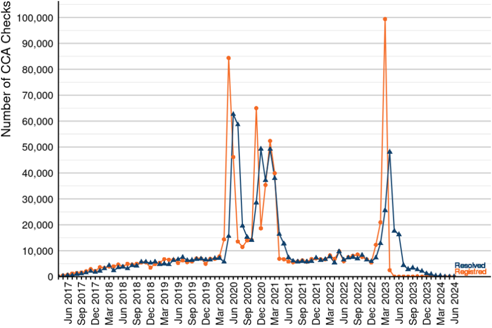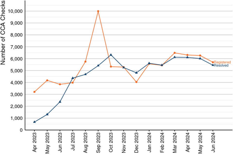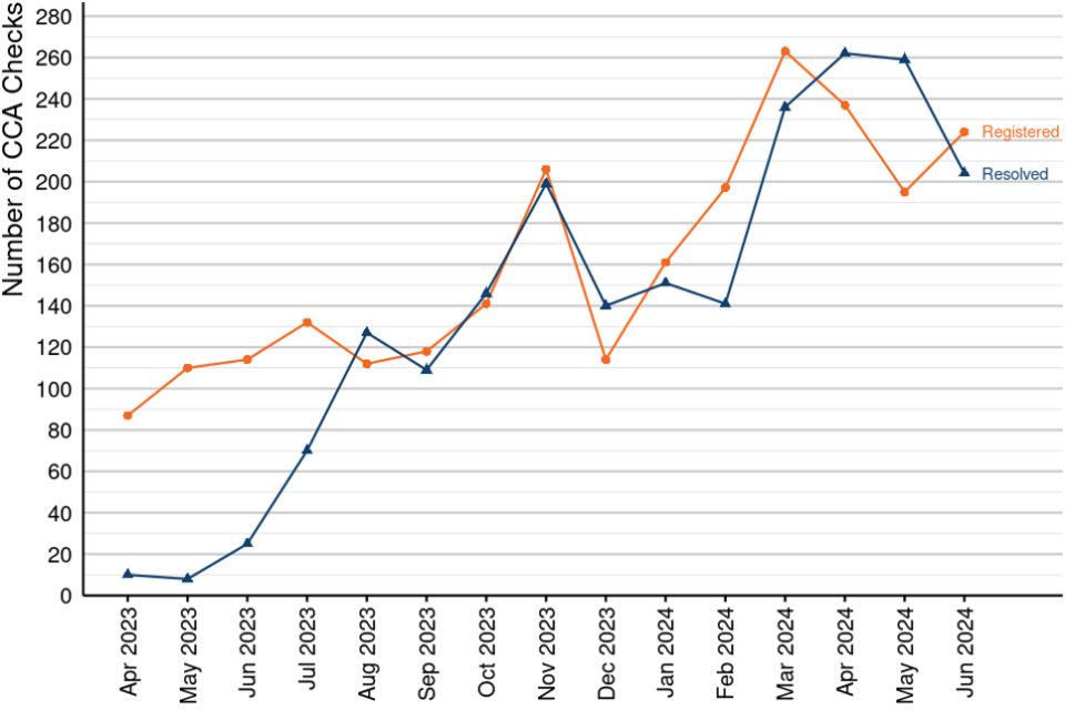 In the latest quarter (April to June 2024), 30 Checks were registered, down from 40 the quarter before and 20 Checks were resolved, down from 1,550 the quarter before.