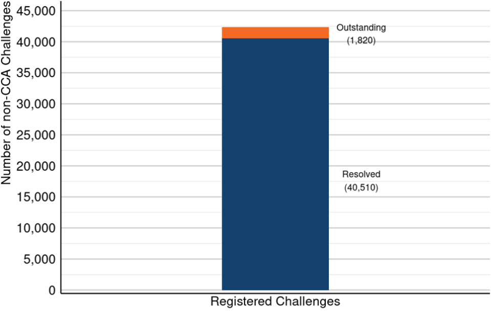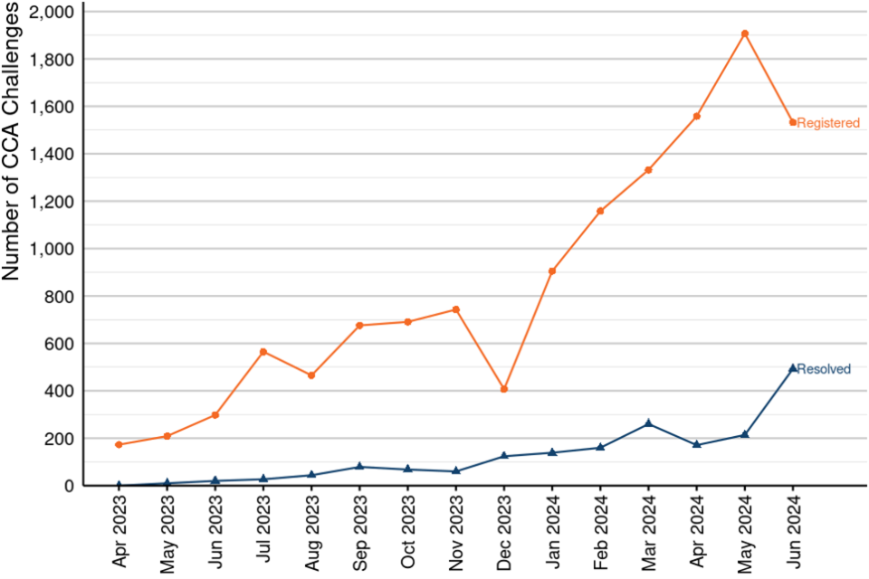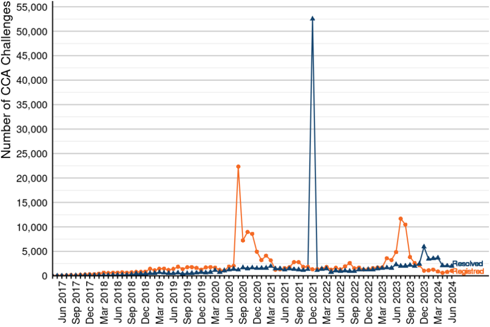 In the latest quarter (April to June 2024), 2,410 Challenges were registered, down from 3,280 the quarter before and 6,130 Challenges were resolved, down from 10,650 the quarter before.