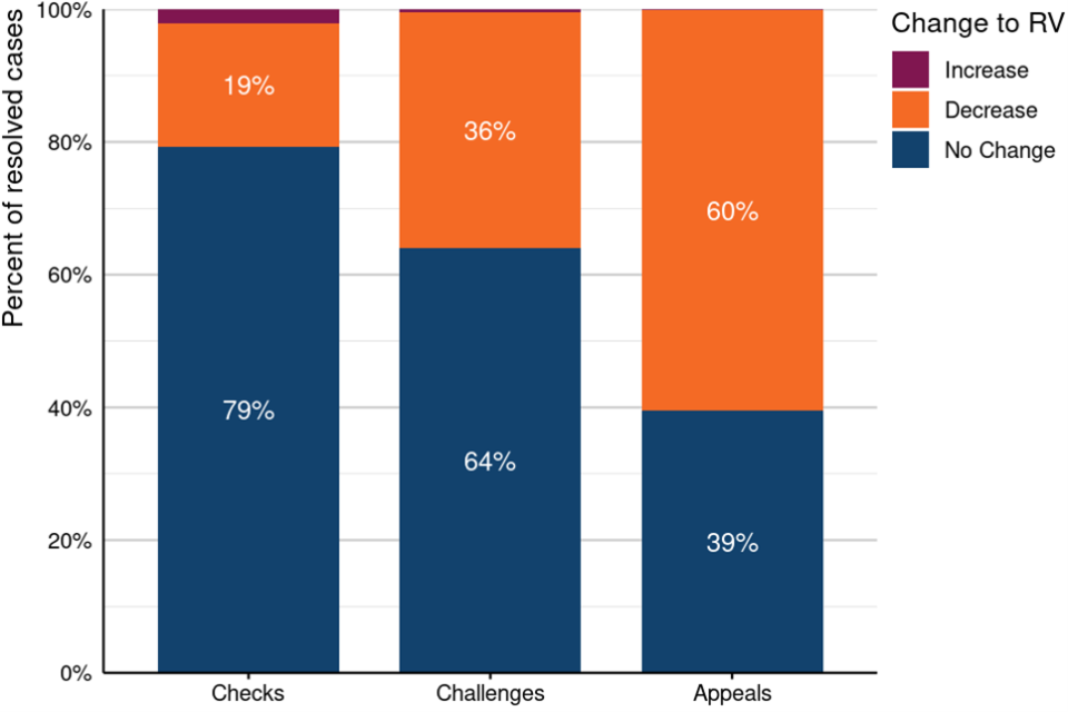 For Appeals, 39% result in no change to RV, 60% result in a decrease and 0.1% result in an increase to RV.