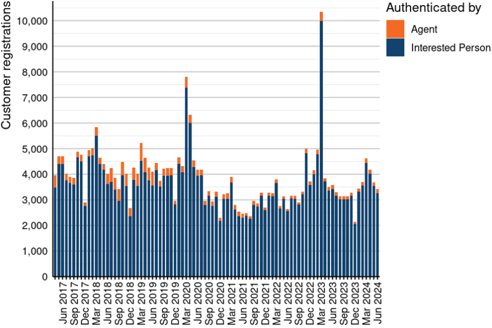 Figure 12: Customer registrations by customer type and month, 1 April 2017 to 30 June 2024