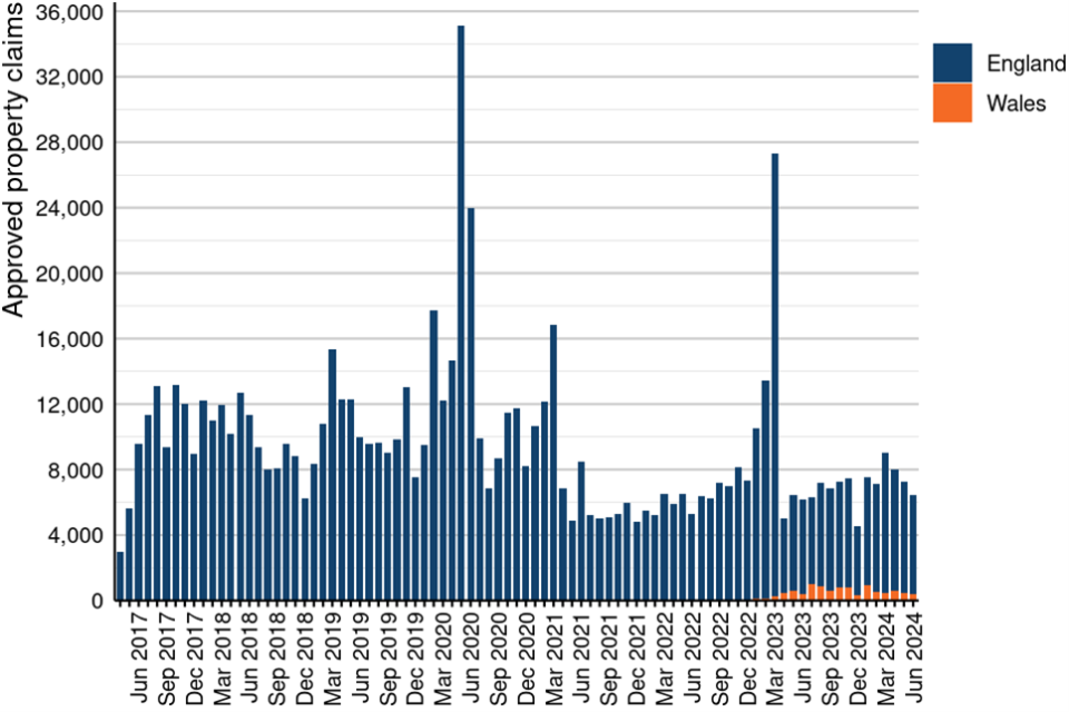 Figure 13: Approved property claims by month and country, 1 April 2017 to 30 June 2024