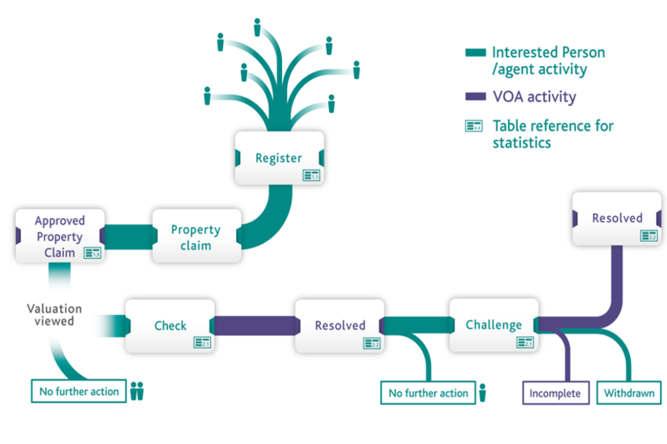 Property claim – before anyone can access more detailed valuation data about a property, they must prove that they have a legal interest in the property under the non-domestic rating legislation, for example as an owner or occupier or both. To do this, they are required to ‘claim their property’ through the VOA’s online service and provide proof of their relationship to the property, such as a copy of a business rates or utility bill. Once the VOA confirm the interested person’s relationship to the property, the claim is approved, and the IP can view or request the detailed valuation for that property. Note that the figures of approved property claims may be adjusted in future publications to reflect where claims have been updated.