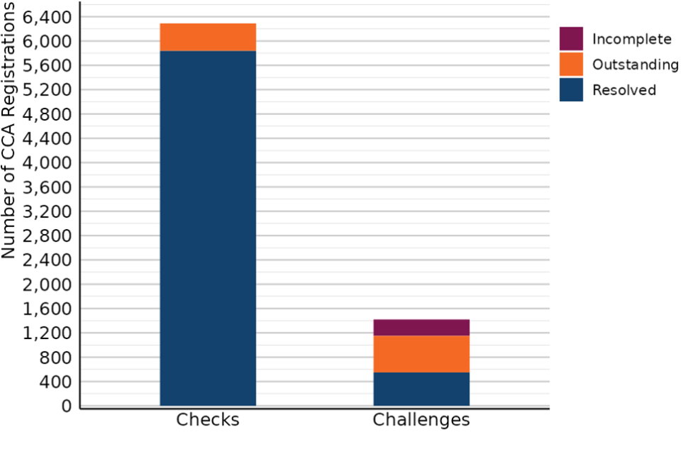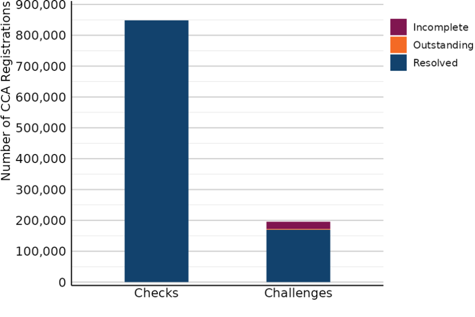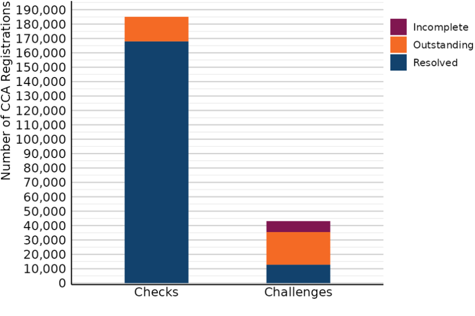 Some of the resolved Checks will progress to Challenges and as such, 43,100 Challenges were registered since the start of the 2023 rating list (1 April 2023 to 30 September 2025). Of these, 12,810 were resolved, 7,610 were marked incomplete (does not contain all the detail required in legislation) and 22,670 remained outstanding.