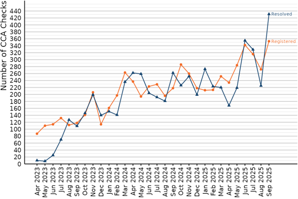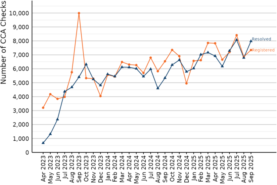 In the latest quarter (July to September 2025), 940 Checks were registered, up from 860 the quarter before and 990 checks were resolved, up from 740 the quarter before.