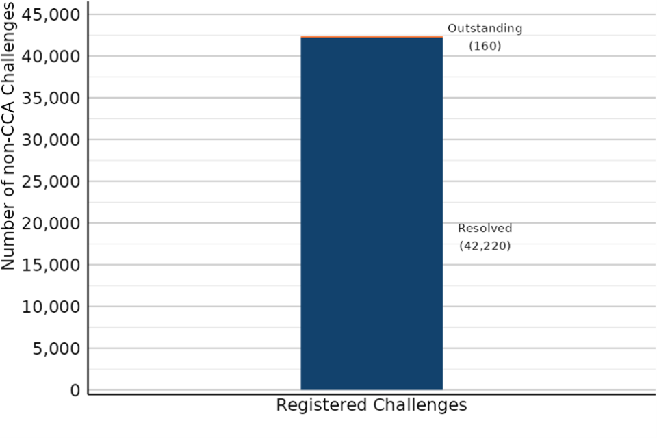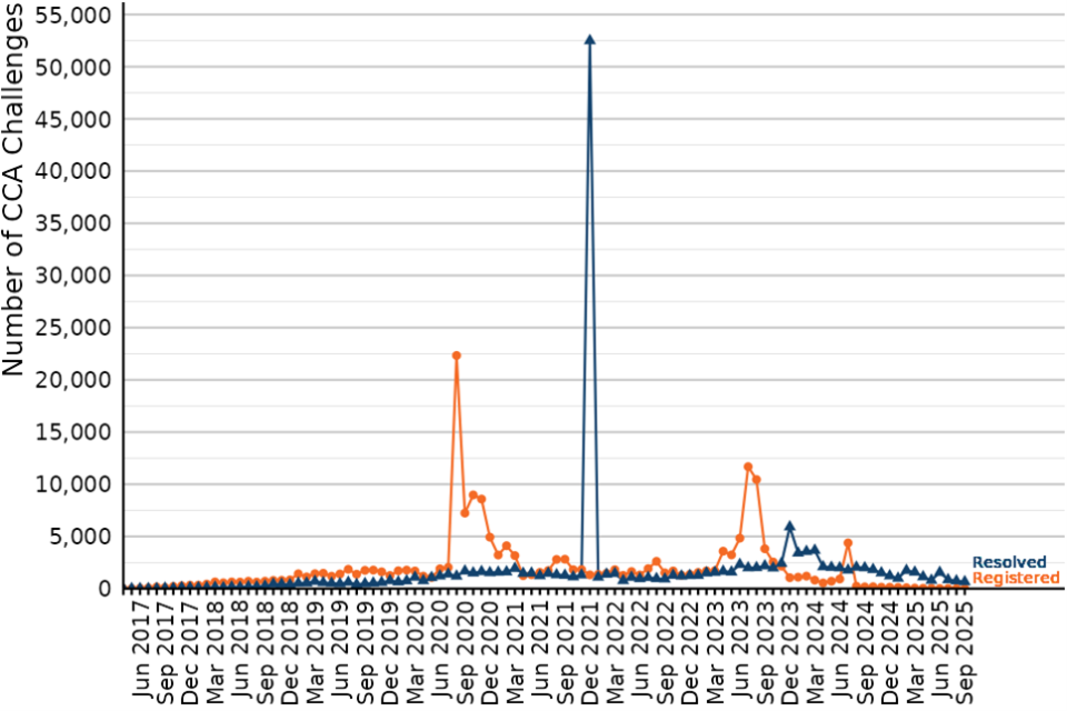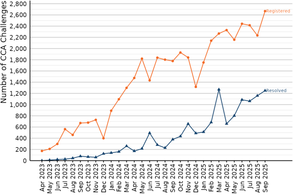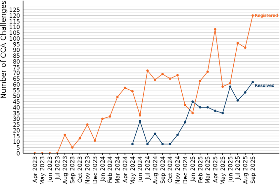 In the latest quarter (July to September 2025), 60 Challenges were registered, down from 90 the quarter before and 2,270 Challenges were resolved, down from 3,490 the quarter before.