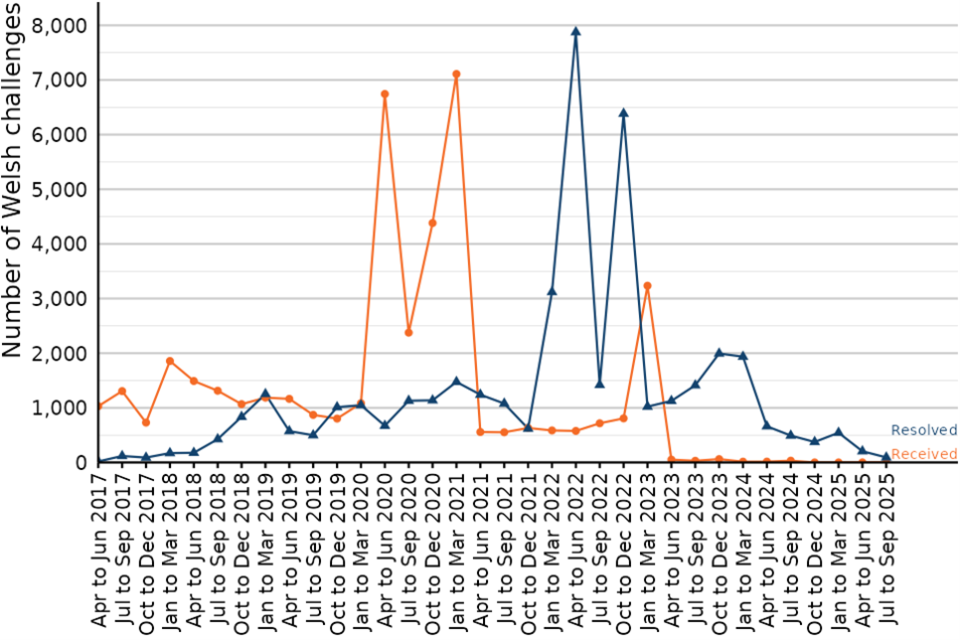 Figure 13 shows the number of challenges received against the Wales 2017 list by quarter. There were 0 challenges registered in the latest quarter (July to September 2025), equal to 0 last quarter, and 90 challenges resolved in the latest quarter, down from 210 last quarter.