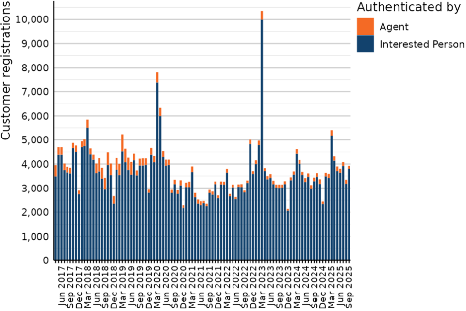 Figure 14: Customer registrations by customer type and month, 1 April 2017 to 30 September 2025