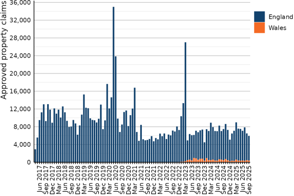 Figure 15: Approved property claims by month and country, 1 April 2017 to 30 September 2025