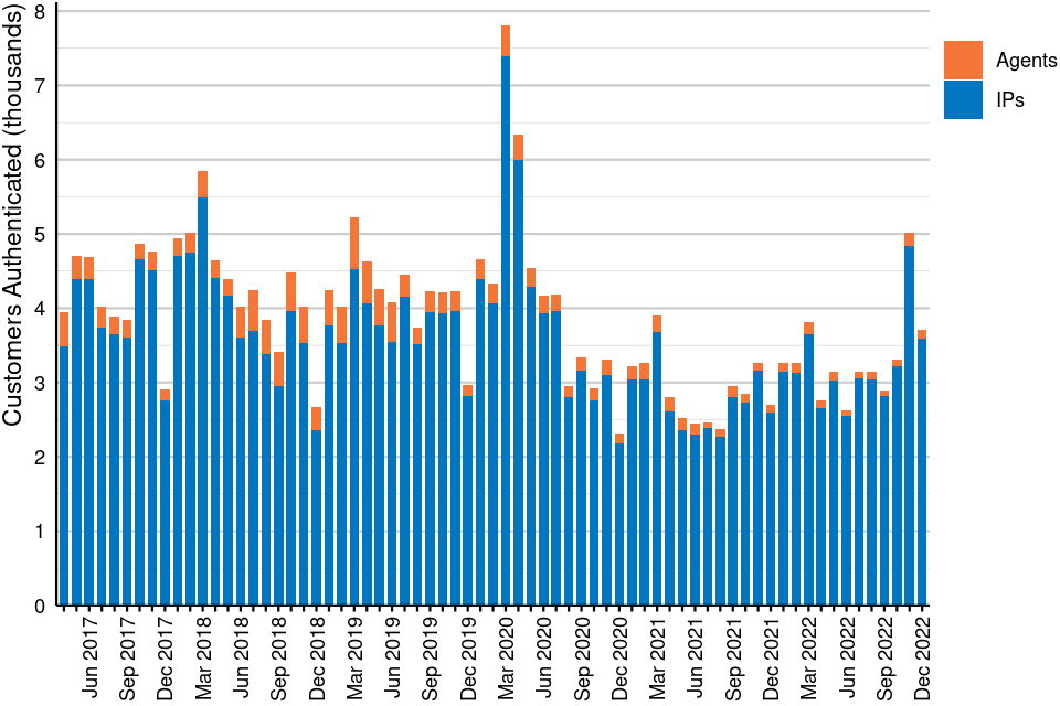 Figure 1: Customer registrations by customer type and month, 1 April 2017 to 31 December 2022