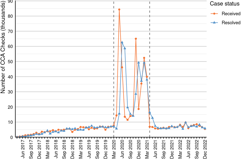 Figure 3 shows the number of checks received by month and case status. Each of the spikes seen in mid-2020 and November 2020 to February 2021 are a result of the Covid-19 pandemic and the Government-imposed restrictions on business; see figure notes.