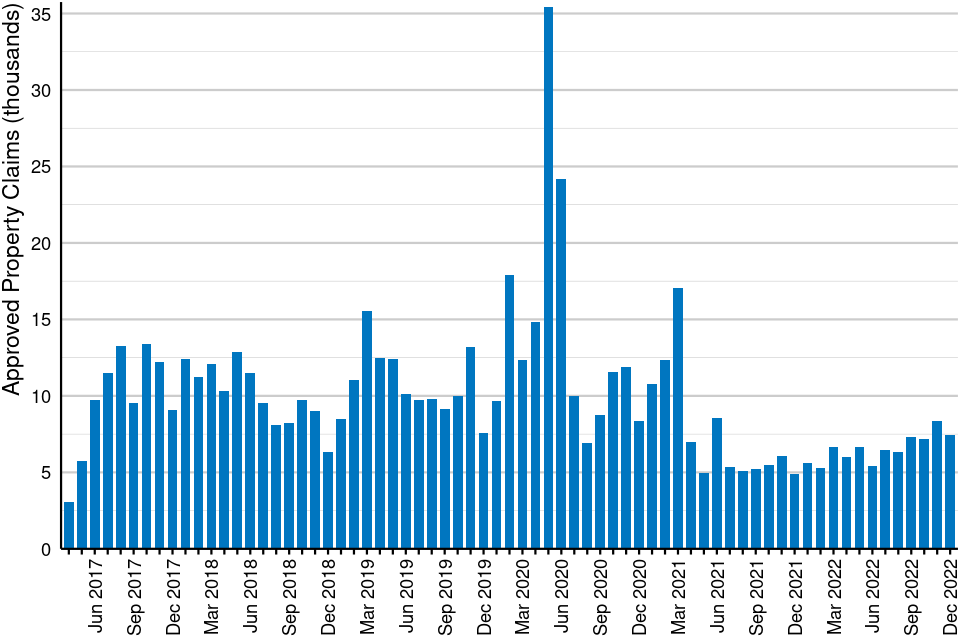 Figure 2: Approved property claims by month, 1 April 2017 to 31 December 2022