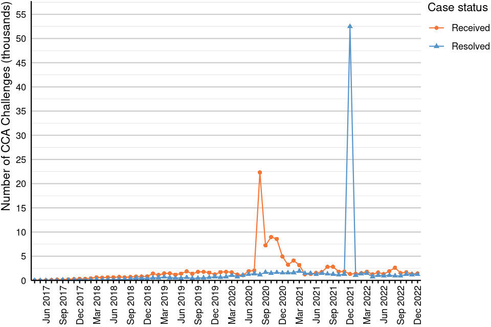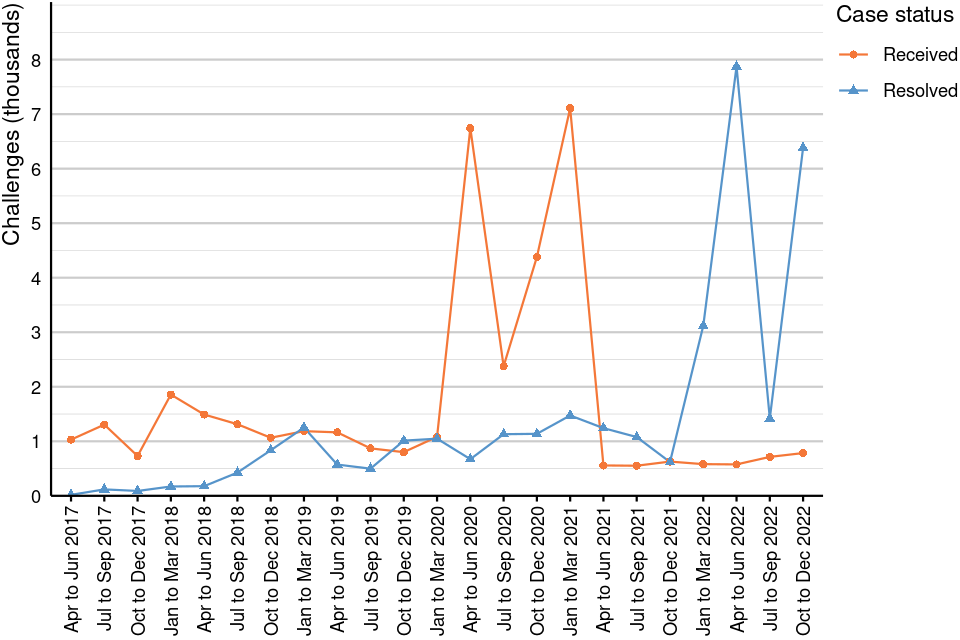 13,170 challenges were outstanding on 31 December 2022, down from 13,950 at the end of the previous quarter