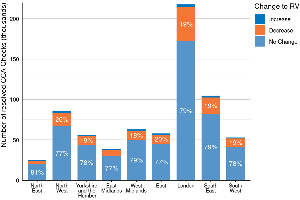 Figure 6 and table 2 show the number of resolved CCA Check cases by geographical region and their outcome. The distribution of Check cases resulting in no change to RV, RV decreases and RV increases was fairly uniform across all of the regions; the outcome of no change to RV ranged between 77% in the East Midlands to 81% in the North East.