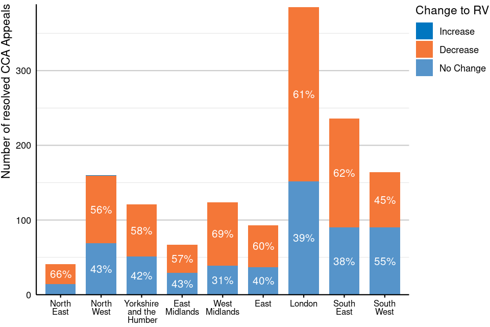 Figure 8 and table 4 show the number of resolved CCA Appeal cases by geographical region and their outcome. For Appeals, the outcome of no change to RV ranged between 31% in the West Midlands to 55% in the South West.