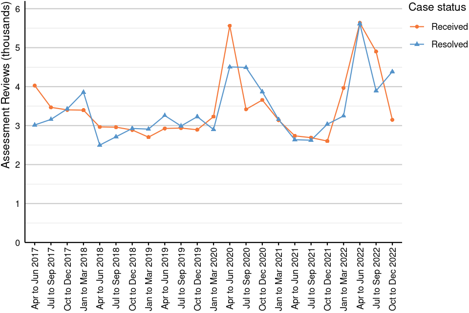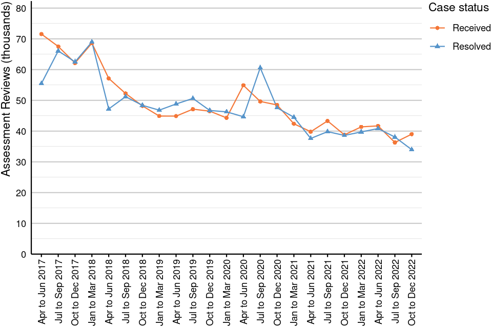 Figure 9 shows that the number of assessment reviews received and resolved against the England 2017 list. In general, the trend shows that the number of assessment reviews has been decreasing since the start of the list; however, there was a brief spike in 2020, likely due to the Covid-19 pandemic.