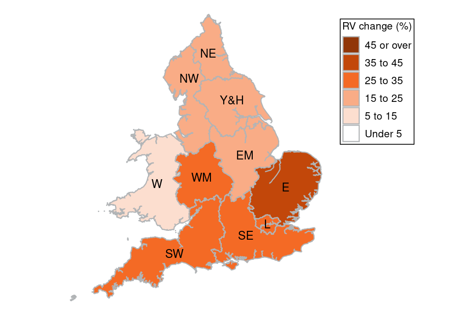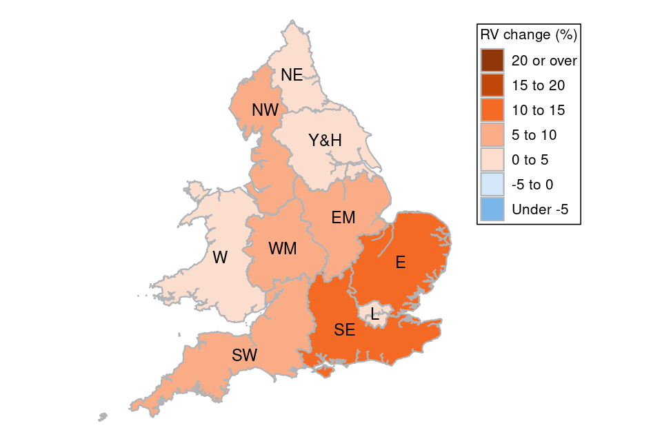 Figure 1: Percentage change in rateable value (RV) between 2017 and 2023 rating lists for English regions and Wales, all sectors