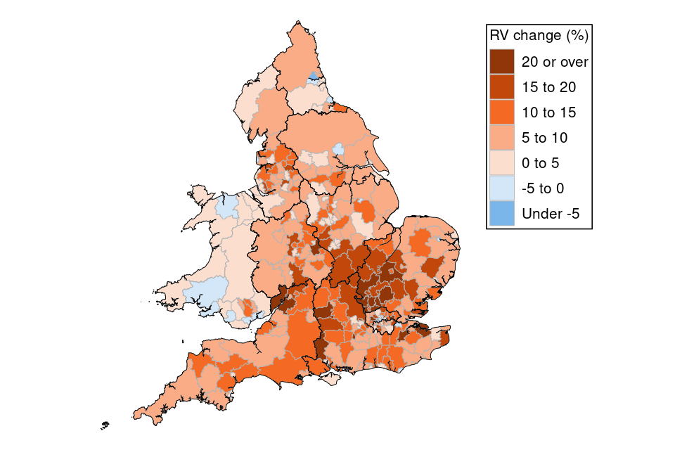 Figure 2: Percentage change in rateable value (RV) between 2017 and 2023 rating lists by administrative area, England and Wales, all sectors