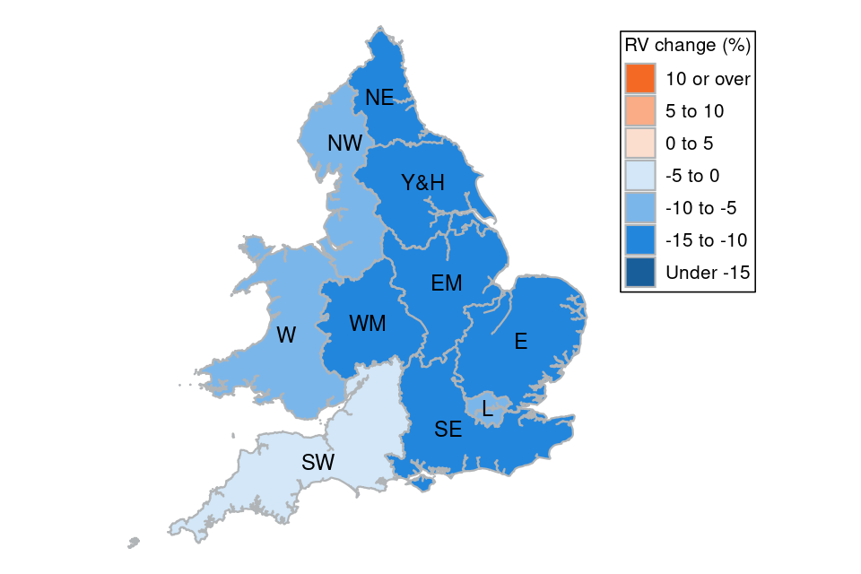- Data tables for each English region and Wales showing the percentage change in rateable value in each sector and administrative area in that region