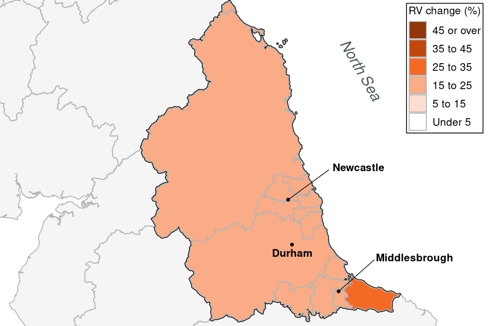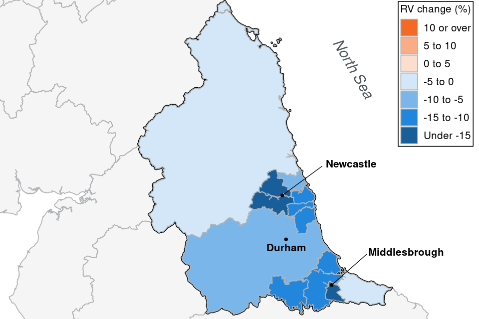 This section provides maps which show differences in the percentage change in rateable value from the 2017 local rating list to the 2023 list by administrative area across the North East region of England. This data, including the look-up for each administrative area, is also presented in Table A2 in the Appendix.