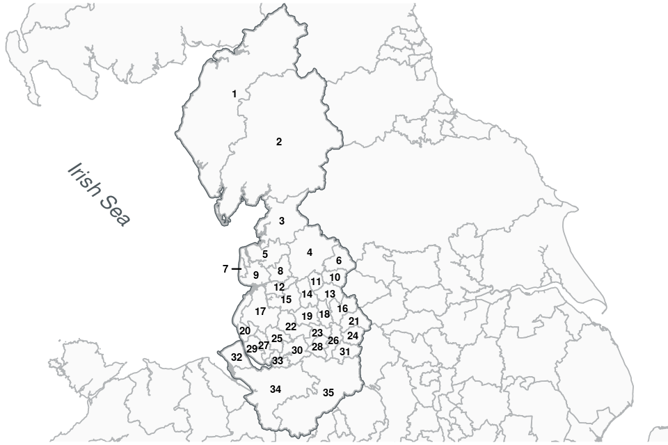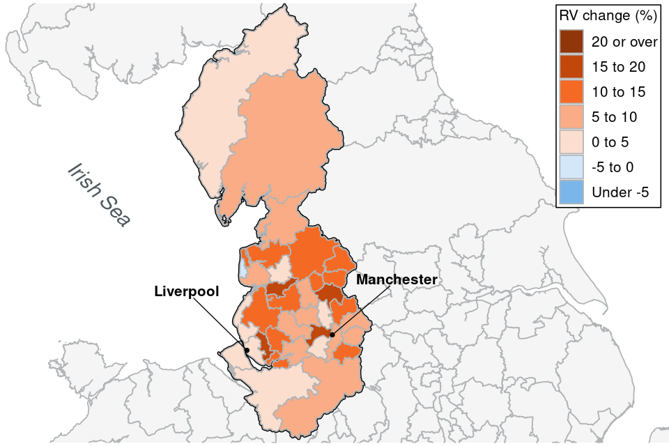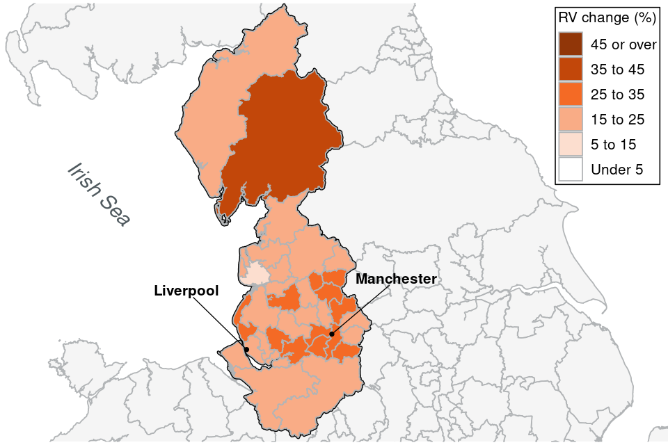 This section provides maps which show differences in the percentage change in rateable value from the 2017 local rating list to the 2023 list by administrative area across the North West region of England. This data, including the look-up for each administrative area, is also presented in Table A3 in the Appendix.