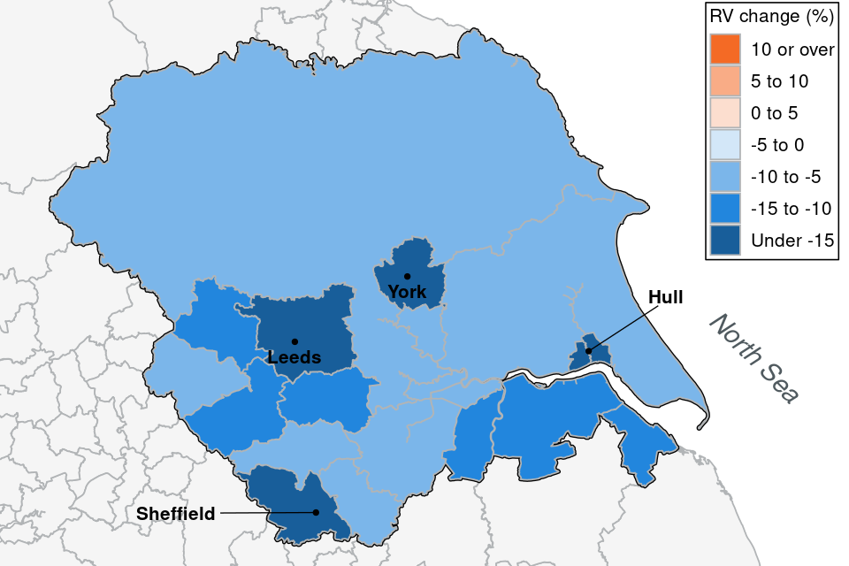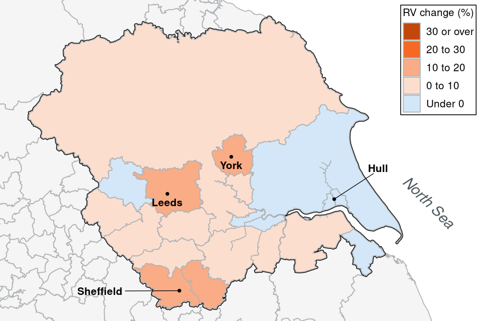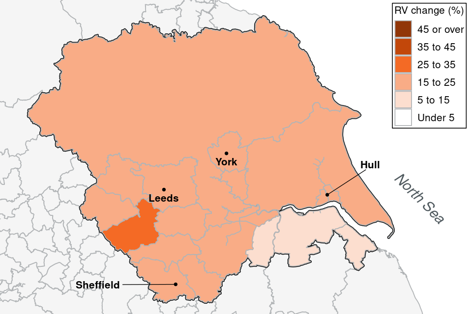 Figure 17: Percentage change in rateable value (RV) between 2017 and 2023 rating lists by administrative area, Yorkshire and the Humber, all sectors