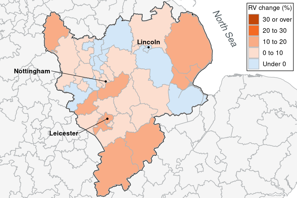 This section provides maps which show differences in the percentage change in rateable value from the 2017 local rating list to the 2023 list by administrative area across the East Midlands. This data, including the look-up for each administrative area, is also presented in Table A5 in the Appendix.