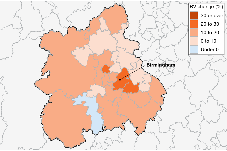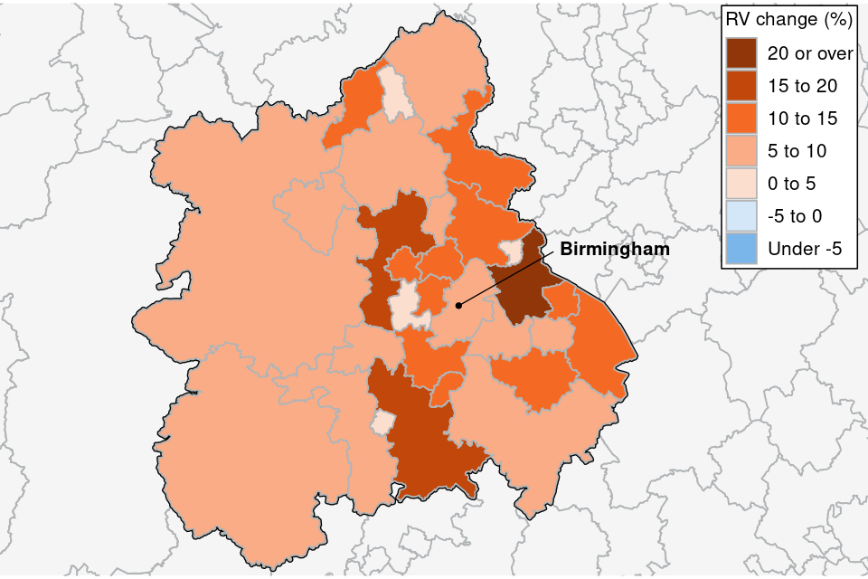 This section provides maps which show differences in the percentage change in rateable value from the 2017 local rating list to the 2023 list by administrative area across the West Midlands. This data, including the look-up for each administrative area, is also presented in Table A6 in the Appendix.