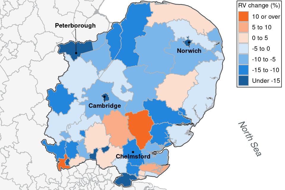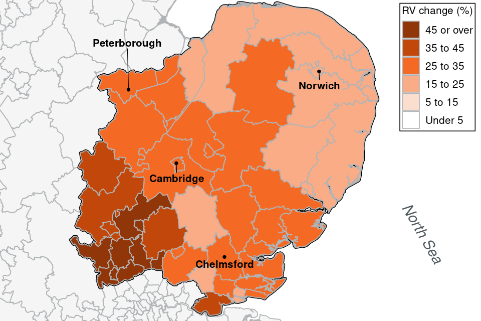 This section provides maps which show differences in the percentage change in rateable value from the 2017 local rating list to the 2023 list by administrative area across the East region. This data, including the look-up for each administrative area, is also presented in Table A7 in the Appendix.