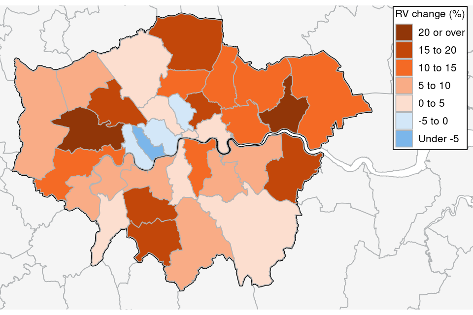Figure 33: Percentage change in rateable value (RV) between 2017 and 2023 rating lists by administrative area, London, all sectors