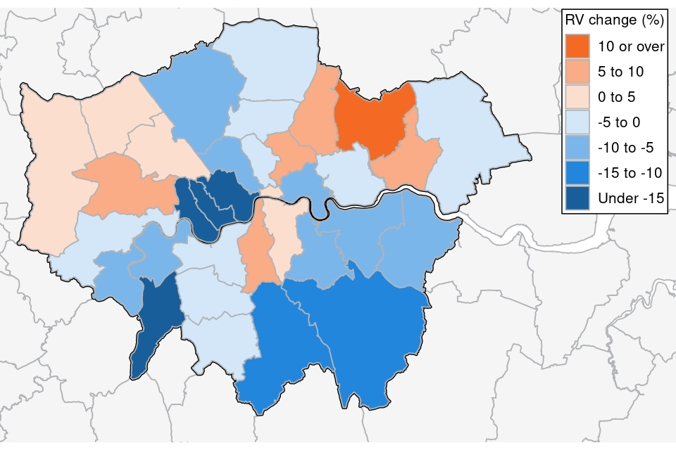This section provides maps which show differences in the percentage change in rateable value from the 2017 local rating list to the 2023 list by administrative area across London. This data, including the look-up for each administrative area, is also presented in Table A8 in the Appendix.